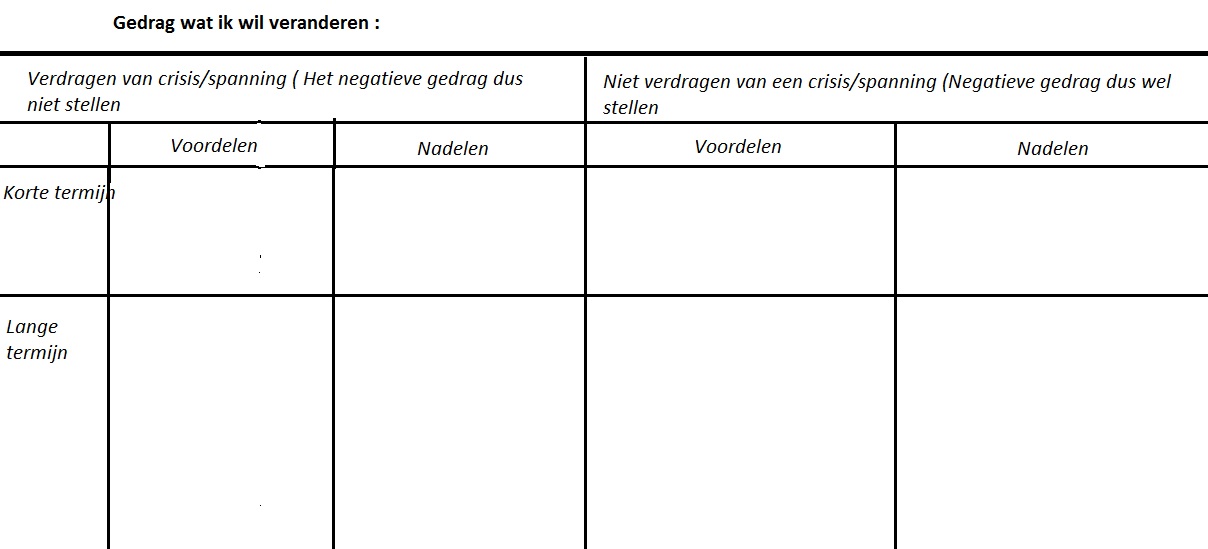 Kies een negatief gedrag dat je stelt of geneigd bent te stellen op een moment van crisis en dat je wilt veranderen. Bv vluchten in drugs, alcohol of automutilatie. Maak hiervan de voors en tegens . Denk na over welke voordelen het heeft om het negatief gedrag te stellen en welke nadelen het heeft. Op korte en lange termijn . Hieronder een bestand met een invulblad voor voors en tegens.